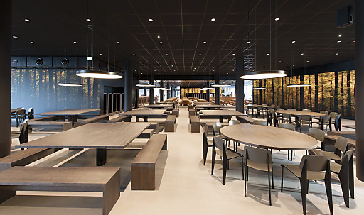 W obrębie stołówki znajduje się kuchnia oraz część jadalna ze stołami i ławkami, a także mały bufet z gotowymi przekąskami.